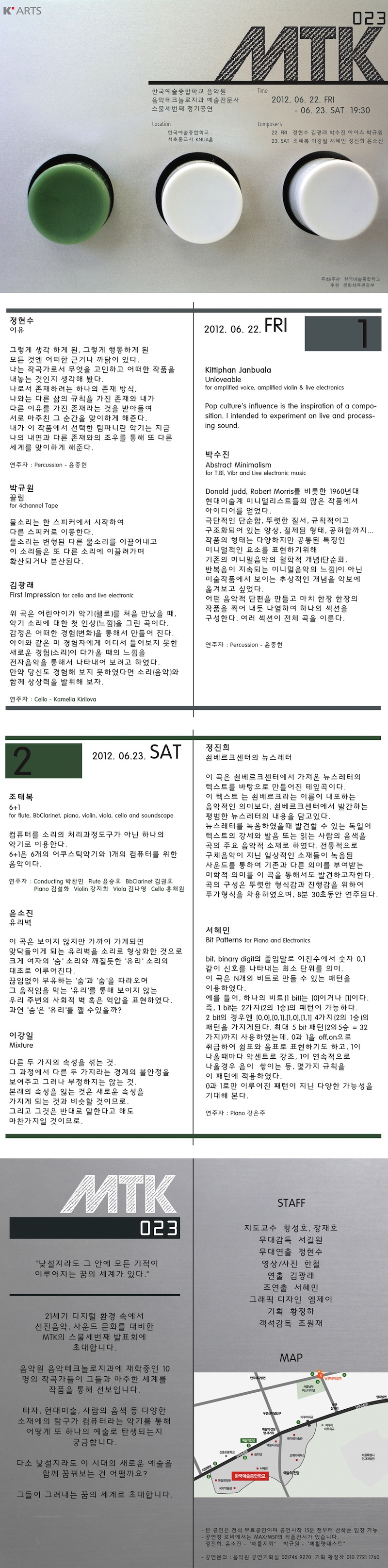 21세기 디지털 환경 속에서 선진 음악, 사운드 문화를 대비한 우리나라 초유의 대학원 교육과정인 한국예술종합학교 음악테크놀로지과의 스물두번째 발표회에 초대합니다. 혹 여러분의 상식과 달라 낯설지라도 그 안에 작지만 우리의 미래 가능성이 있을 수도 있습니다. 미지의 세계에 들어선 탐험가처럼 섬세한 호기심으로 이들의 성과를 지켜봐 주십시오. 감사합니다. - 담당 교수 황성호